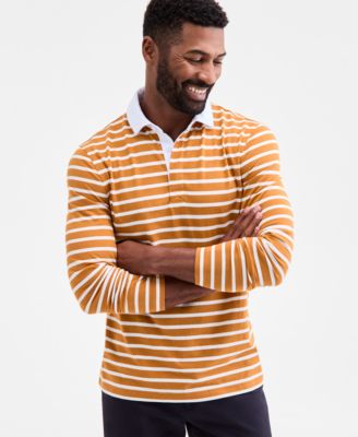 Club Room’s rugby shirt features sleek pencil stripes and a contrasting solid collar for a classic look.