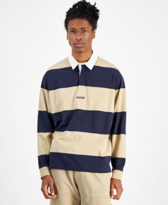 Channel a classic, rugby-inspired look in this all-cotton stripe logo shirt from HUGO by Hugo Boss, complete with a crisp white point collar at the neck.
