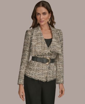 Donna Karan New York rethinks the tweed jacket, adding oversized lapels and a removable faux-leather belt for waist definition.
